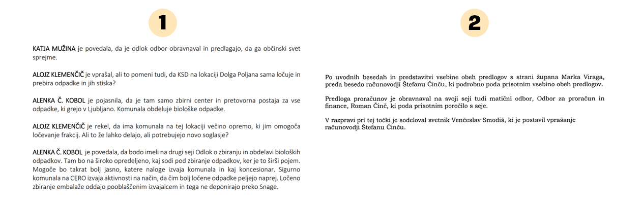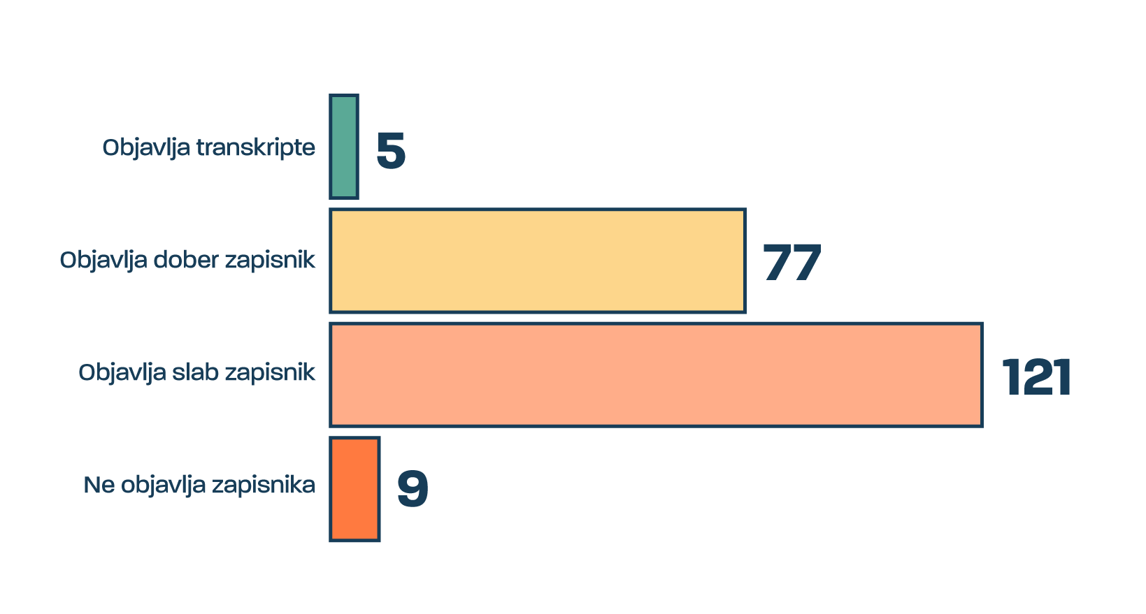 Čeprav je objava transkriptov najboljši način informiranja občank in občanov, pa lahko te nadomestijo tudi dobri in natančni zapisniki. A izsledki naše raziskave kažejo, da kar 61 % občin pripravlja slabe zapisnike, ki nenatančno povzemajo razprave sej občinskih svetov, na spletnih mestih 9 občin pa ni mogoče najti niti slabih zapisnikov sej.