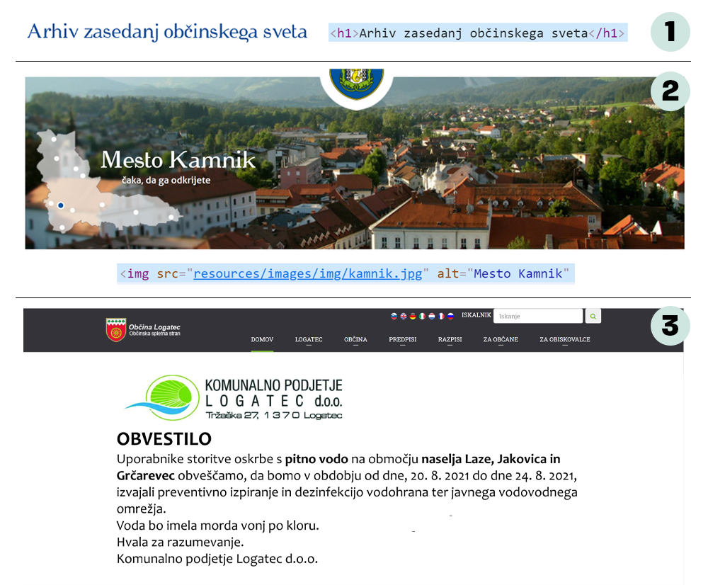 Vse te elemente uporablja zgolj 8,5 % občinskih spletnih mest, 2,8 % pa ne uporablja niti enega od njih. Največjo težavo občinam povzroča raba lastnosti alt, ki od administratorjev spletnega mesta zahteva tekstovni opis vsake slikovne vsebine, medtem ko velika večina spletnih mest uporablja elemente H.