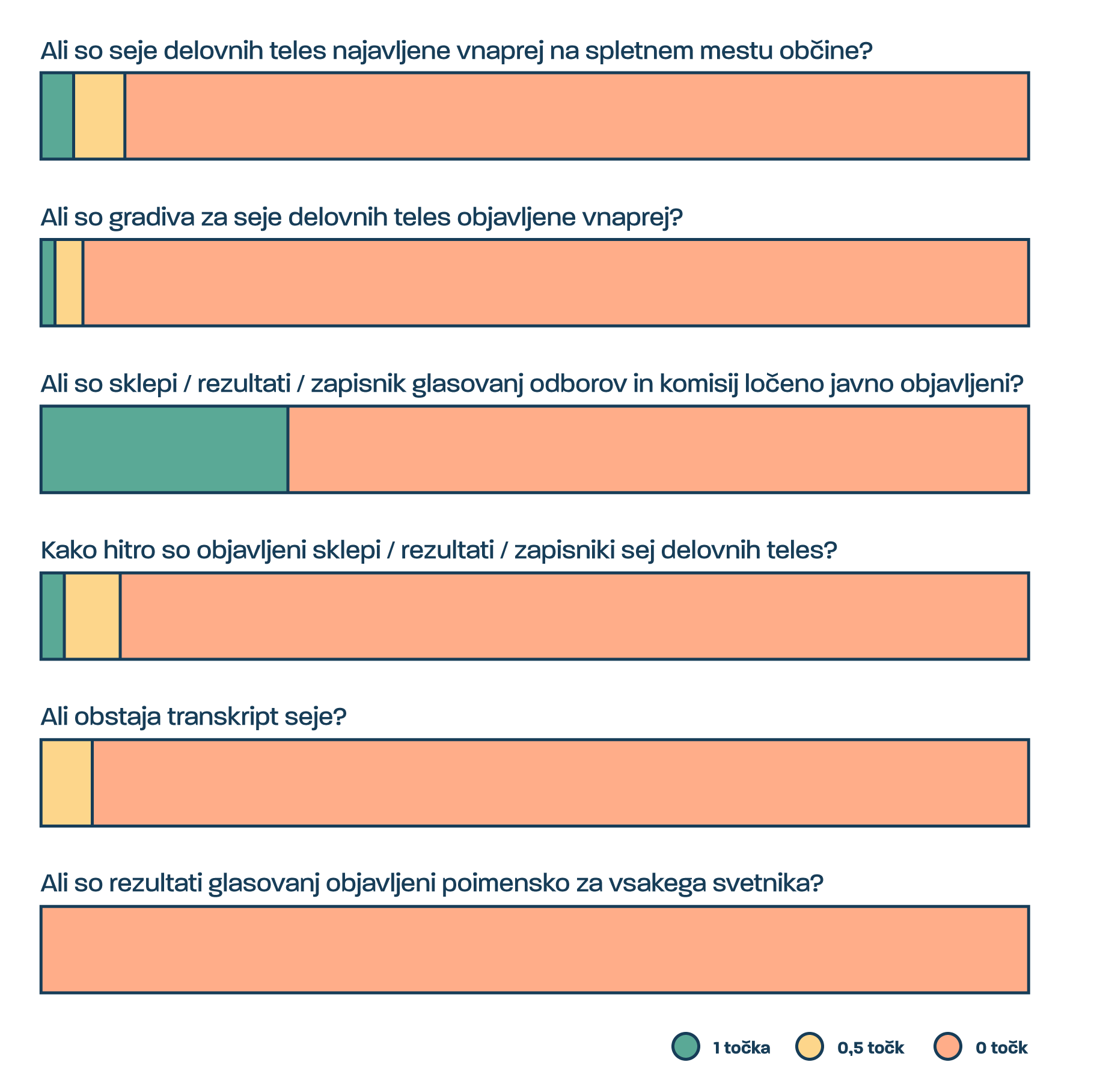Čeprav je pohvalno, da kar 89 % občin objavlja, kateri svetniki so člani katerih delovnih teles, pa je to pogosto tudi edini poizkus transparentnosti na tem področju. Poleg informacije o članstvu pa smo transparentnost delovanja delovnih teles ocenjevali s šestimi indikatorji, s katerimi smo preverjali, če so seje delovnih teles najavljene vnaprej in gradiva za sejo objavljena, če in kako hitro so objavljeni sklepi glasovanj, če obstaja zapisnik oziroma dober povzetek ter če so objavljeni individualni rezultati glasovanj. Kar neverjetnih 147 občin v tem sklopu ni doseglo niti ene same točke, kar pomeni, da občankam in občanom ne ponudijo niti kančka vpogleda v postopek sprejemanja odločitev na ključnih področjih svojega delovanja.